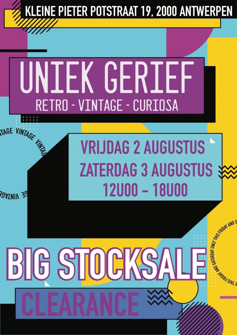 Antwerpen2 augustus 2024 --- 3 augustus 2024Stocksale georganiseerd door Uniek Gerief wegens sluiting van de fysieke winkel. Je shopt hier retro- en vintage meubelen en curiosa.