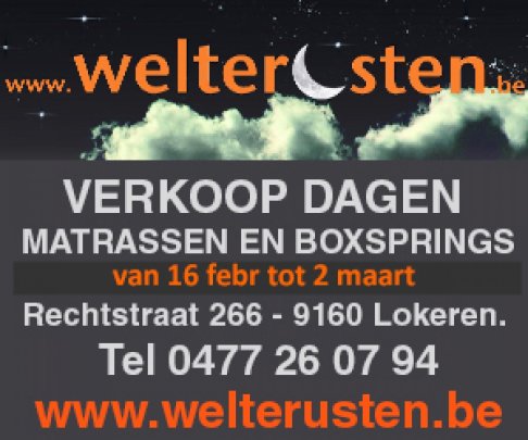 lokeren1 oktober 2016 --- 15 oktober 2016Uitzonderlijke verkoop van MATRASSEN-BOXSPRINGS-BEDTEXTIEL We gaan plaats maken voor de nieuwe collectie, opruiming van de stock en de toonzaal. Tijdens de Verkoop Dagen extra kortingen op alle matrassen