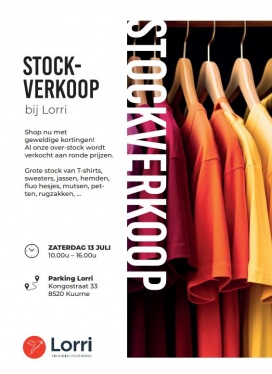 Stockverkoop georganiseerd door Lorri Printing. Je shopt onbedrukte t-shirts, sweaters, jassen, hemden, fluo-hesjes, mutsen, petten, rugzakken en meer aan ronde prijzenl,