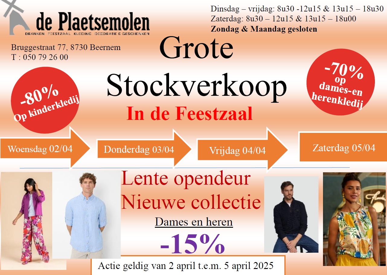 Grote stockverkoop op dameskledij, herenkledij en kinderkledij.