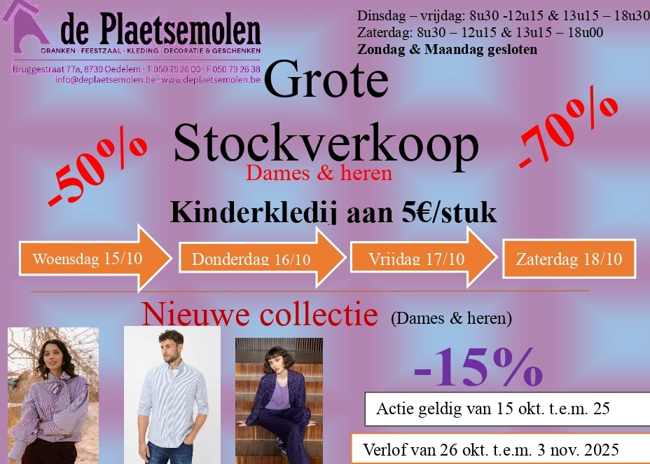 Grote stockverkoop op dameskledij, herenkledij en kinderkledij.