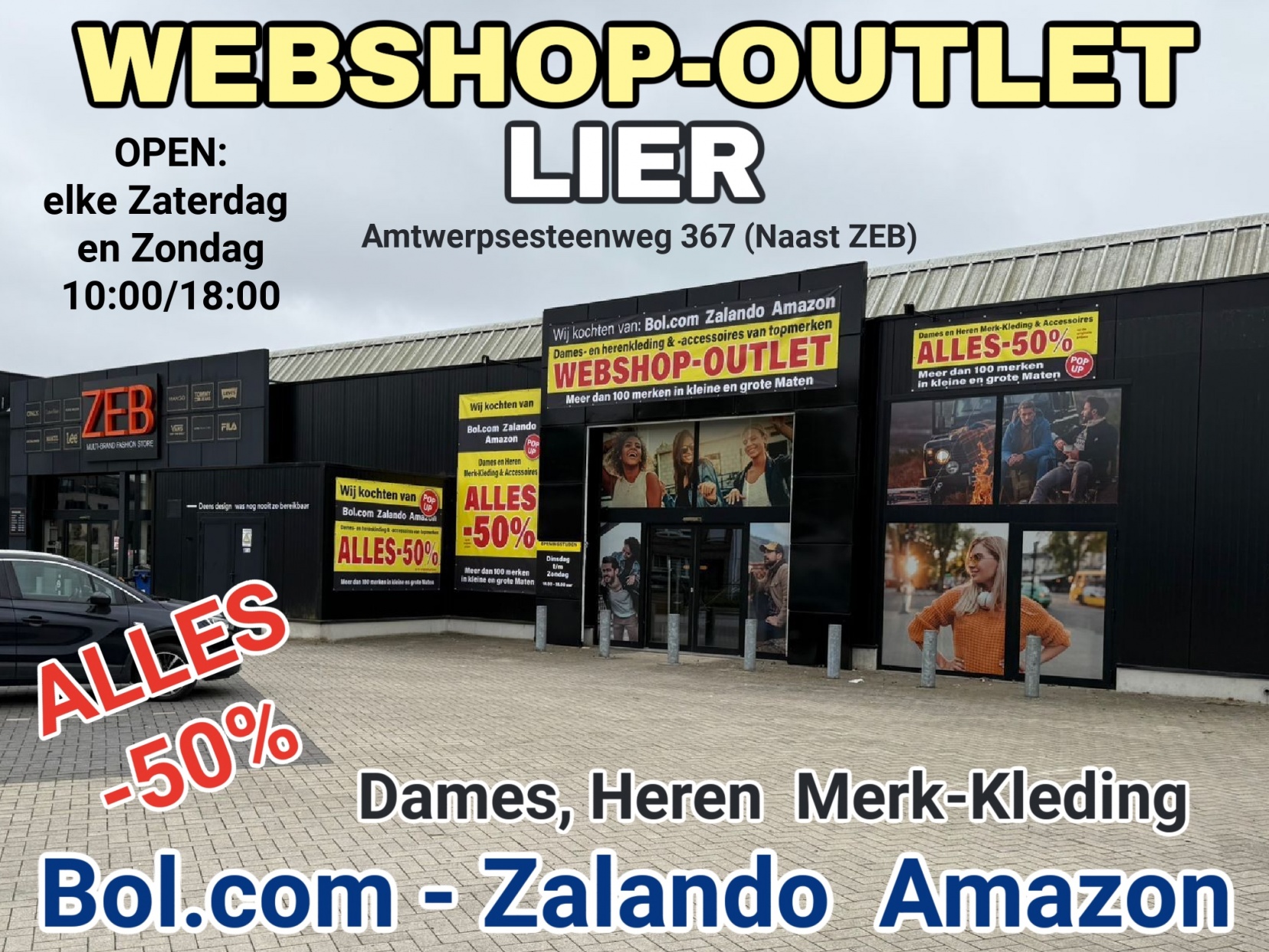 NU OPEN Webshop-Outlet LIER Wij Kochten van Bol.com-Zalando en Amazon 80.000 stuks Dames en Heren Merkkleding en Accessoires in Kleine en Grote Maten met meteen op ALLES -50% op de Originele Prijzen.