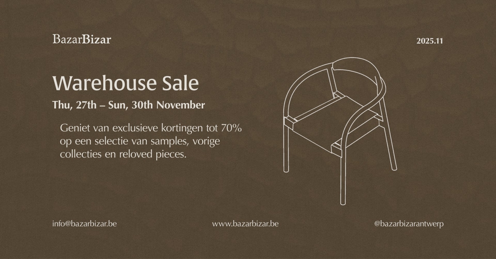 Warehouse sale georganiseerd door Bazar Bizar van meubelen en deco items aan kortingen tot -70%. De verkochte items zijn showroommodellen, stukken die het gamma verlaten en unieke stukken.