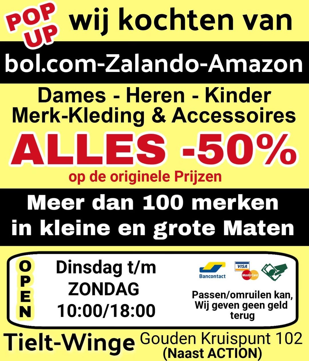 Webshop-Outlet Tielt-Winge Wij Kochten van Bol.com-Zalando en Amazon 80.000 stuks Dames, Heren en Kinder Merkkleding en Accessoires in Kleine en Grote Maten met meteen op ALLES -50% op de Originele Prijzen. Wij Vullen dagelijks aan. Betalen kan met Cash, Bancontact en Creditcard. Omruilen en Passen kan wij geven geen geld terug. OPEN:: Dinsdag t/m Zondag 10:00/18:00 ADRES: Gouden Kruispunt 102, TIELT-WINGE (naast Action) www.WEBSHOP-OUTLET.sale