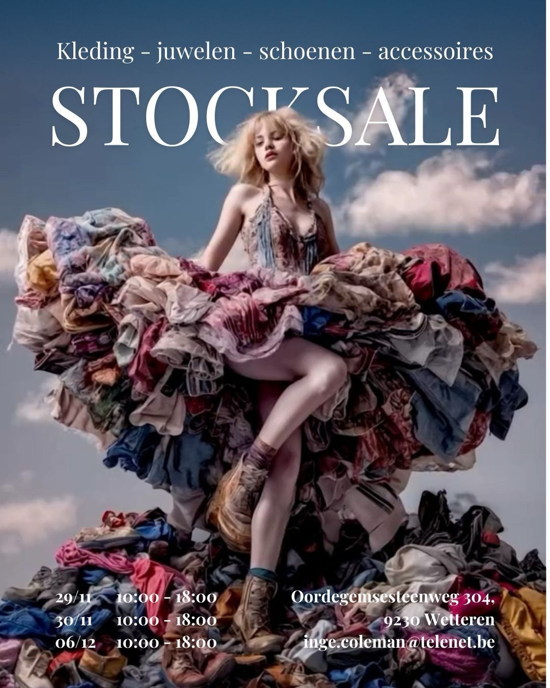 Stockverkoop van kledij, schoenen en accessoires voor dames, heren en kinderen.