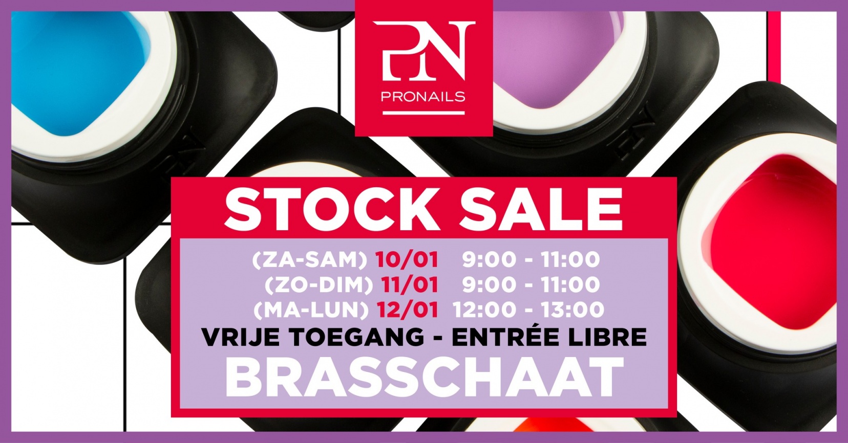 Stocksale georganiseerd door ProNails van nagellak, semi-permanente lak, gellak voor gelnagels, trendy nail art items, verzorgingsproducten, kledij & accessoires en meer.