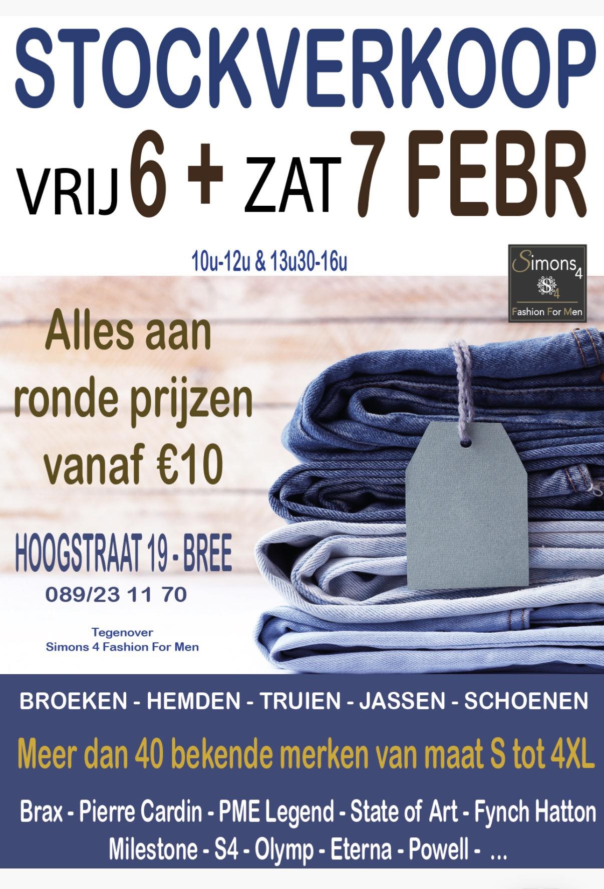 Stockverkoop georganiseerd door mannenmodezaak Simons 4. Je vindt hier broeken, jassen, hemden, truien, schoenen en meer voor heren. Alles wordt verkocht aan ronde prijzen vanaf €10. Je vindt hier merken zoals Brax, Pierre Cardin, PME Legend, State of Art, Fynch Hatton, Milestone, S4, Olymp, Eterna, Powell en meer
