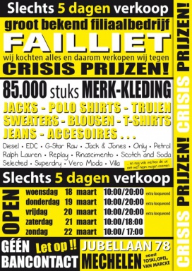 Slechts 5-dagen verkoop van MERK-KLEDING tegen CRISIS prijzen in Mechelen van woensdag 18 maart t/m 22 Maart 2015