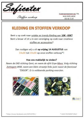 Dan nodigen wij u uit op vrijdag 14 AUGUSTUS van 14u00 tot 19u00 op onze stoffen verkoop*!