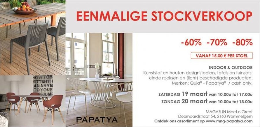 Kunststof en houten designstoelen, tafels en tuinsets: einde reeksen en (licht) beschadigde producten aan kortingen van -60%, -70% en -80%. Vanaf 15,00€ per stoel. Ontdek ons assortiment op www.mng-papatya.com. Cash only.