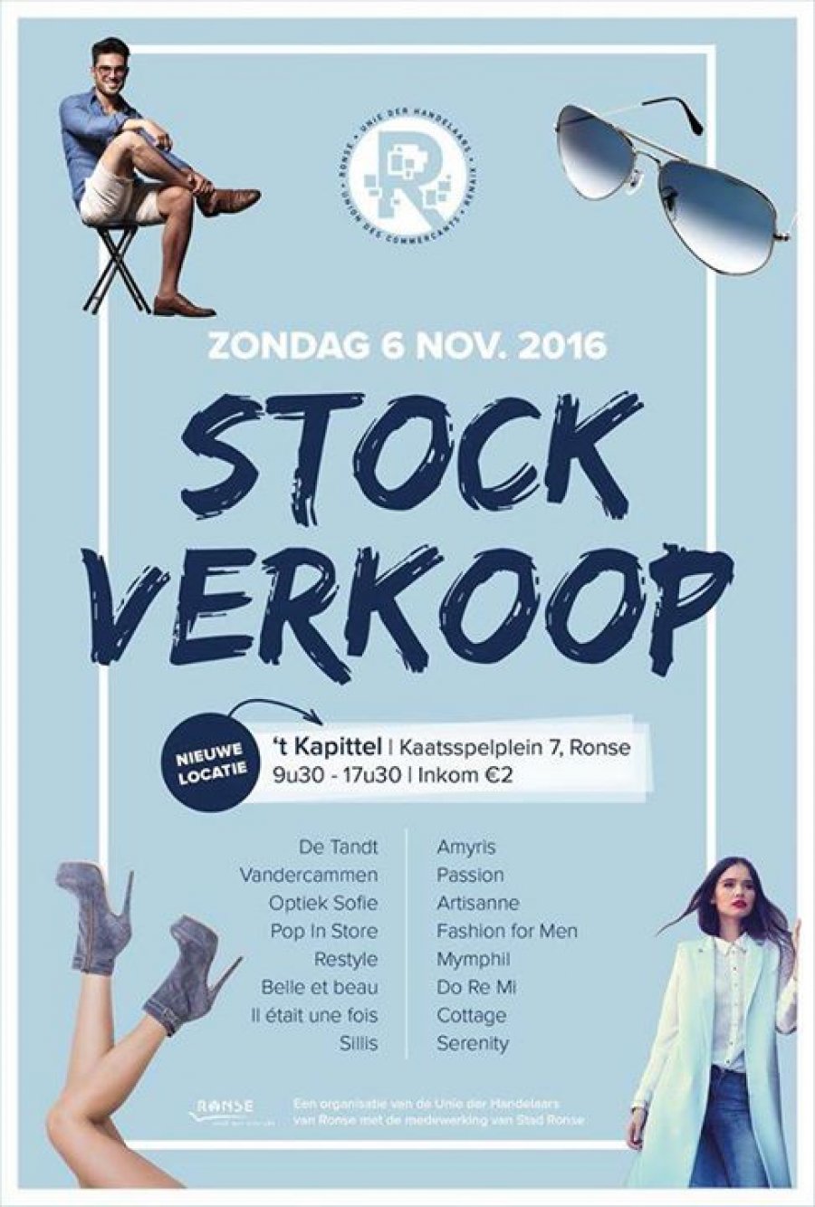 Stockverkoop georganiseert door de Unie Der Handelaars van Ronse. Winkels die meedoen zijn: De Tandt, Vandercammen, Optiek Sofie, Pop in Store, Restyle, Belle et beau, I etait une fois, Sillis, Amyris, Passion, Artisanne, Fashion for men, Mymphil, De Re Mi, Cottage, Serenity